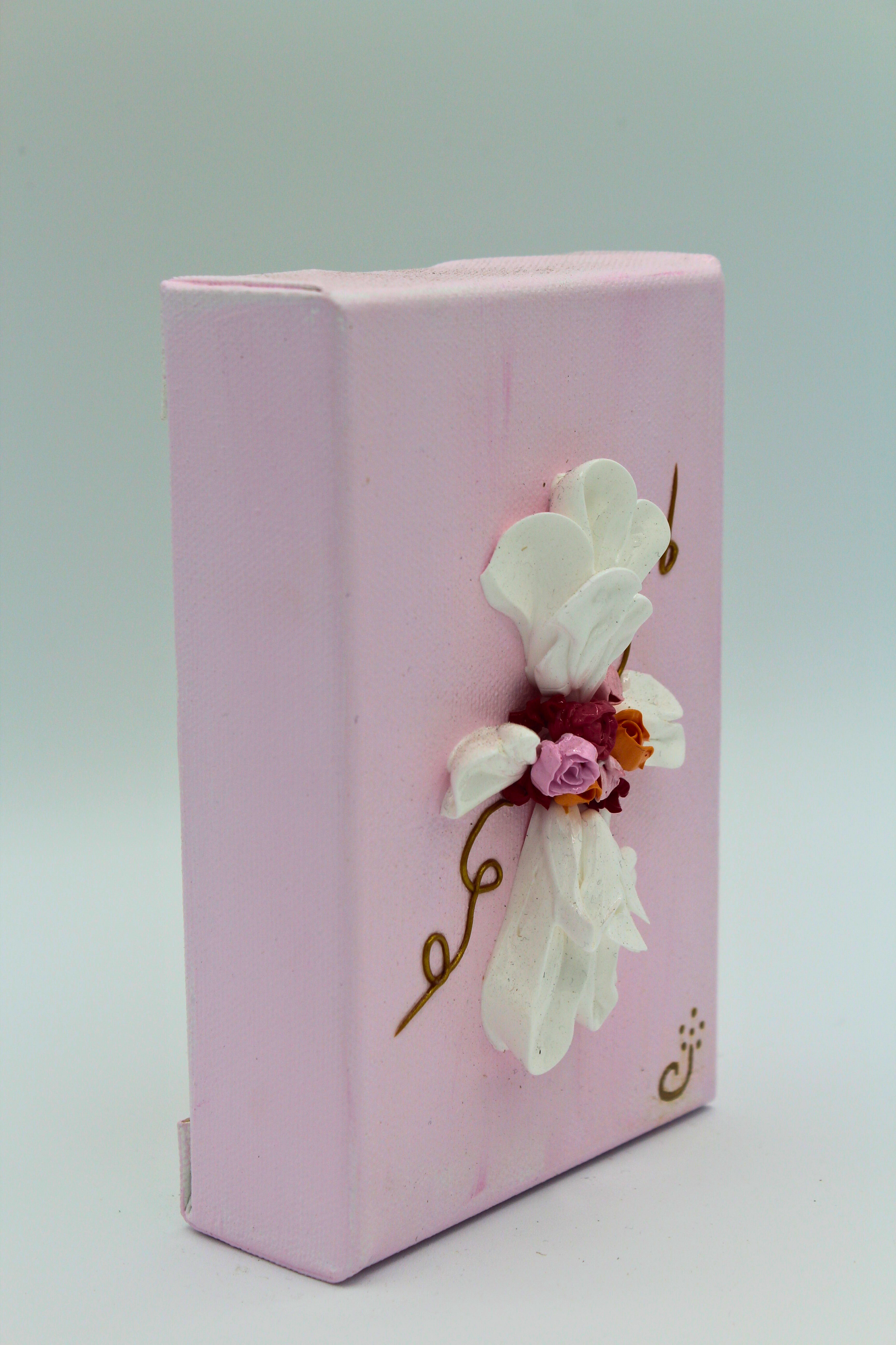 At the heart of the piece blooms a bouquet of vibrant roses and blossoms in rose, coral, and lavender hues, representing love, renewal, and inner peace. The soft pink background envelops the composition in warmth and serenity, enhancing its ethereal tone.