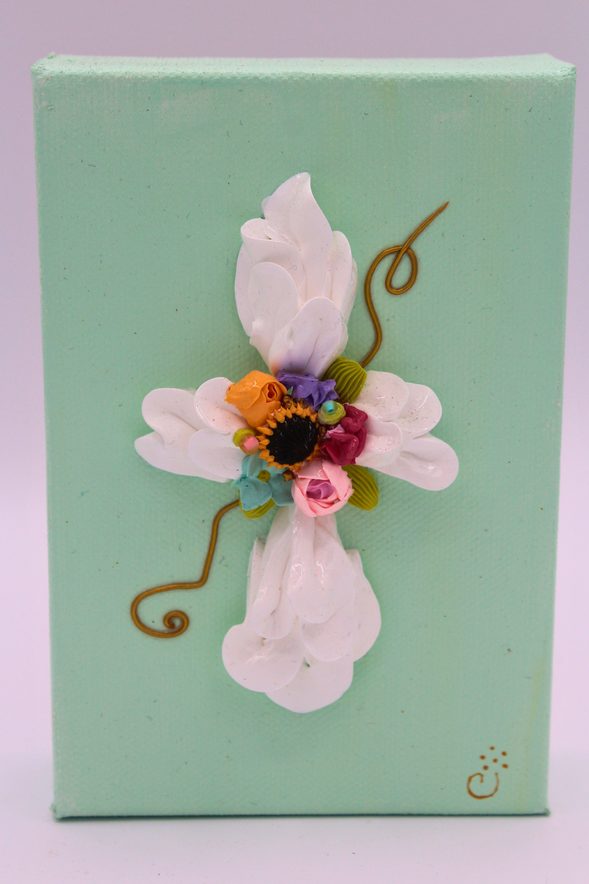Garden Grace blossoms with vibrant life and quiet reverence, uniting texture, color, and form into a radiant expression of natural beauty. At the heart of the piece, a lively cluster of miniature blooms—sunflower yellow, rose pink, lavender, and sky blue—emerges from sculpted white petals that flow outward like gentle wings. Golden vine-like flourishes swirl across the canvas, lending a sense of movement and organic harmony.