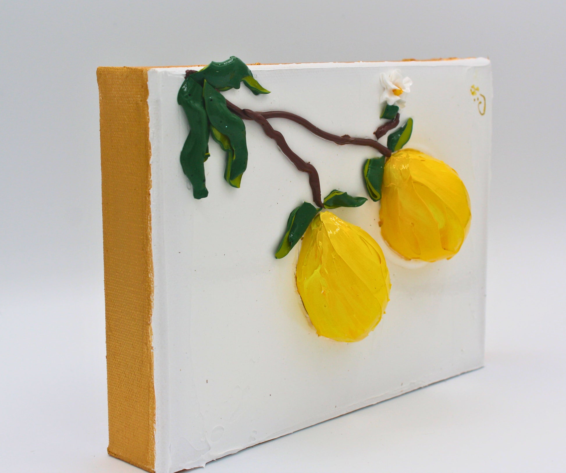 This textured 6 x 8 painting captures the quiet elegance of nature through the simplicity of two golden lemons suspended from a slender branch. Set against a clean white background, the composition balances light, color, and form in perfect harmony.