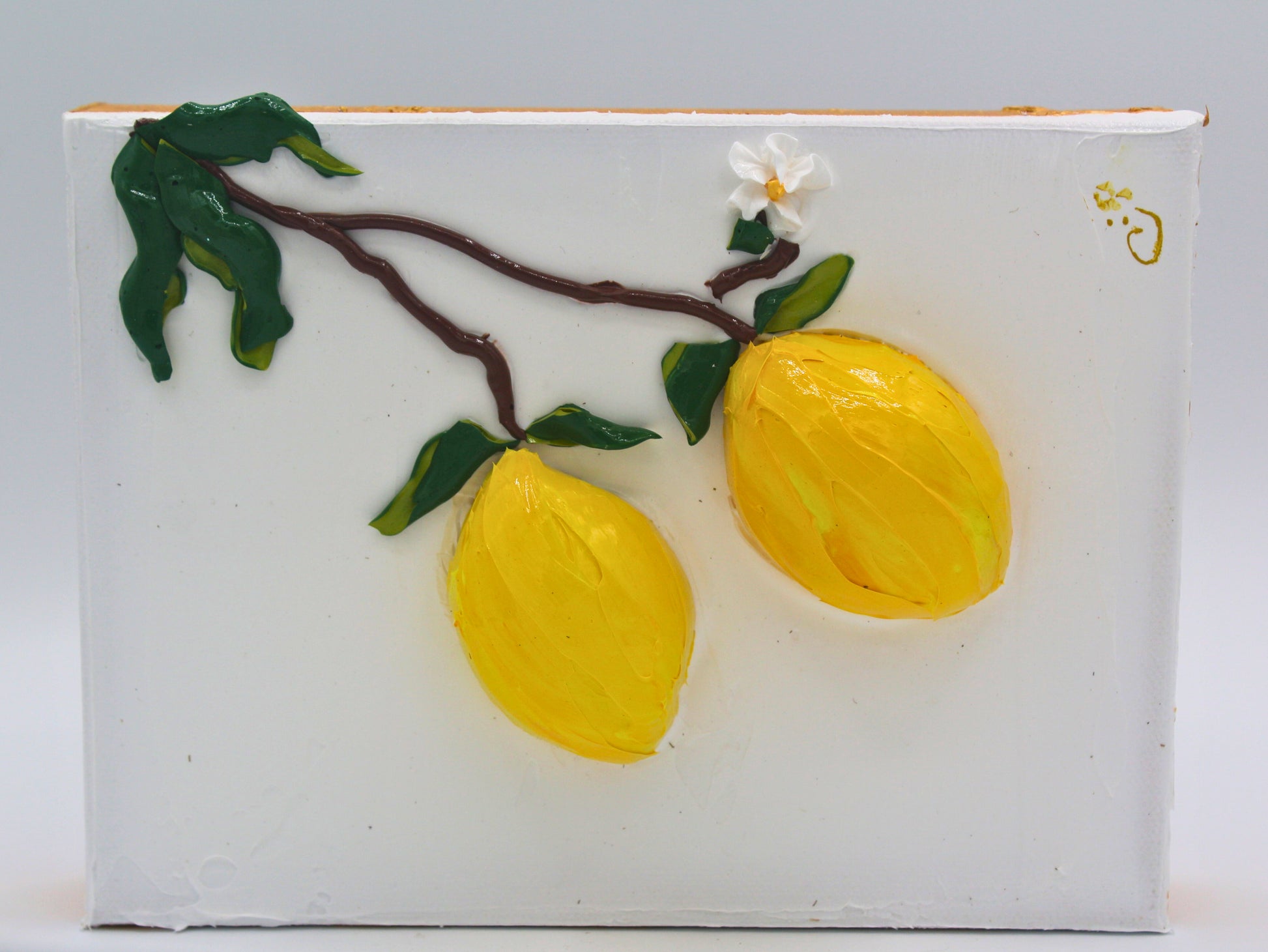 The lemons, sculpted in thick, impasto layers of radiant yellow, glow with a sunlit vibrancy that suggests warmth and vitality. Their glossy texture contrasts beautifully with the matte white surface beneath, evoking both freshness and abundance. Deep green leaves curl naturally along the branch, while a delicate white blossom—small yet purposeful—introduces a note of softness and