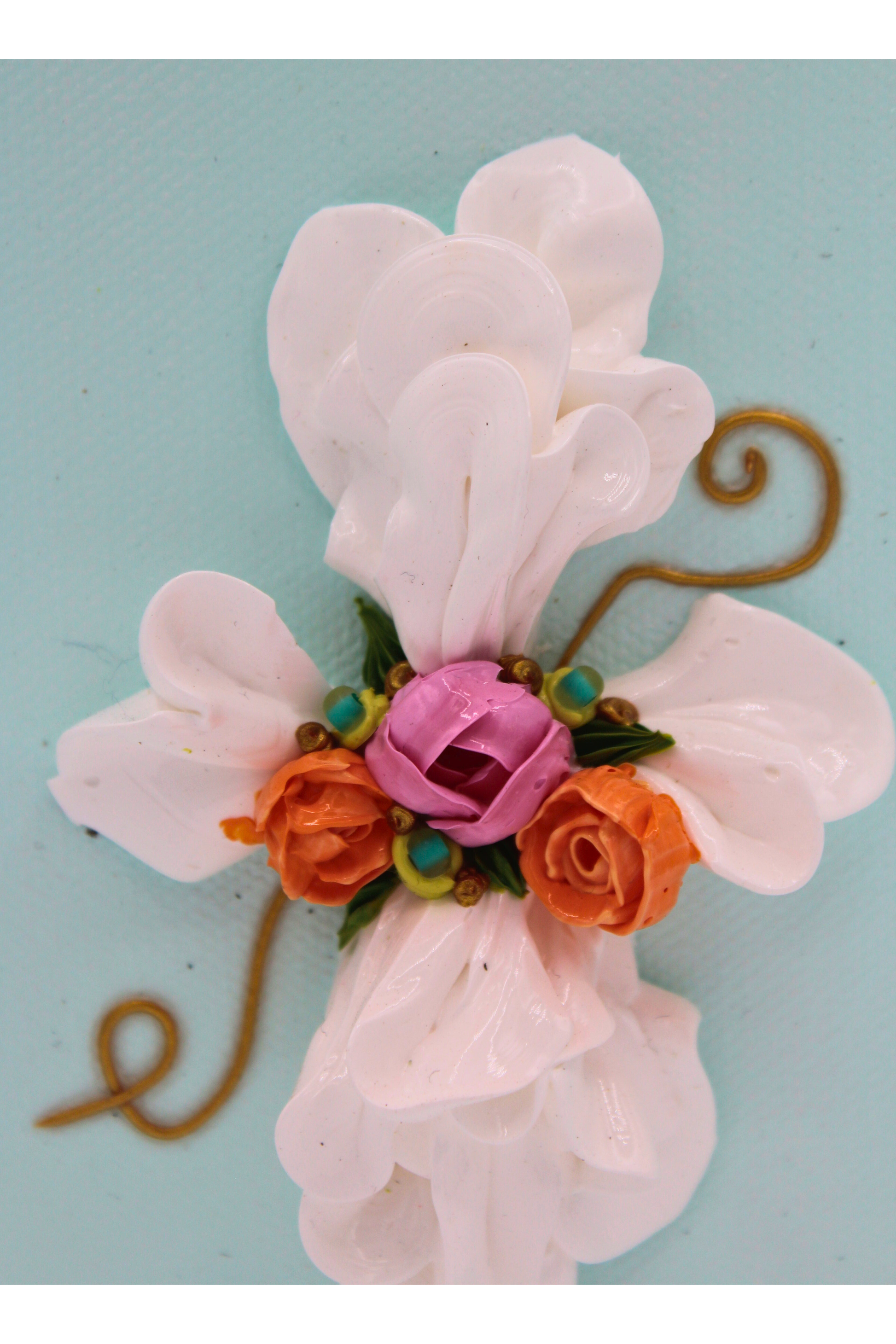 This delicate 3D floral composition embodies serenity and renewal through sculptural texture and graceful color balance. At its heart blooms a trio of miniature roses—two in warm amber tones and one in soft lilac—symbolizing harmony and tenderness. Surrounding the bouquet, sweeping white petals flow outward like gentle wings, evoking purity and quiet strength. Elegant golden swirls accent the form, guiding the viewer’s eye and adding a touch of refined movement.